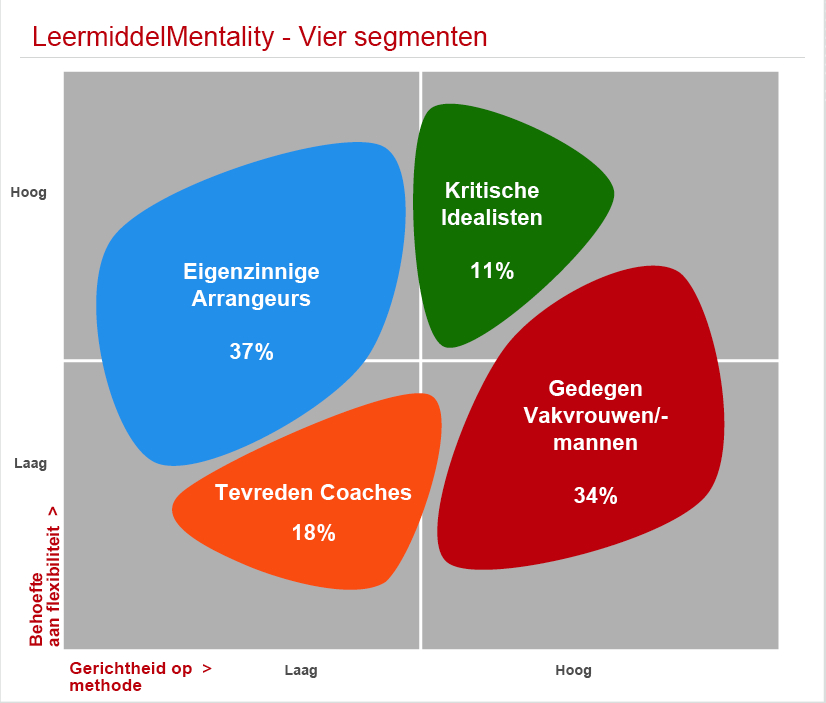 ª Kritische Idealisten (11%): veeleisende, vakgerichte didactici, die willen vertrouwen op de kwaliteit van de methode, maar ook meer maatwerk en actualiteit zoeken. Zij missen de ondersteuning die zij nodig hebben om deze ambitie te