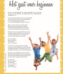 Terug van vakantie: wat fijn om elkaar weer te zien en om bij te praten! Dat doe je ook met dit pop/upbeat lied.