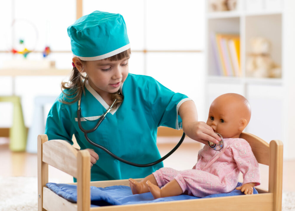 ‘De baby is heel ziek, juf,’ vertrouwt Lisa me toe. ‘Hij moet spugen. En hij gaat straks ook hoesten en niezen.’ O jee, dat klinkt niet al te best. ‘Hij heeft ook koorts.’ Lisa gaat nog even door. ‘En waterpokken. En corona. En oorpijn.’ Het arme ding. ‘Gelukkig gaan wij goed voor hem zorgen.’ Ja, gelukkig maar. En goed gezorgd wordt er. De meiden pakken bakjes (voor het spugen), nieuwe outfits (deze zijn zo vies van alle waterpokken) en knuffeldieren (dat helpt als je niet lekker bent). Er wordt voor de baby gekookt, al is niet iedereen het daarover eens – want moet hij van al die pannenkoeken niet juist extra spugen? Hij doet dutjes terwijl de meisjes het huis opruimen. I-de-aal. Ik zou ook wel zo in de watten gelegd willen worden.