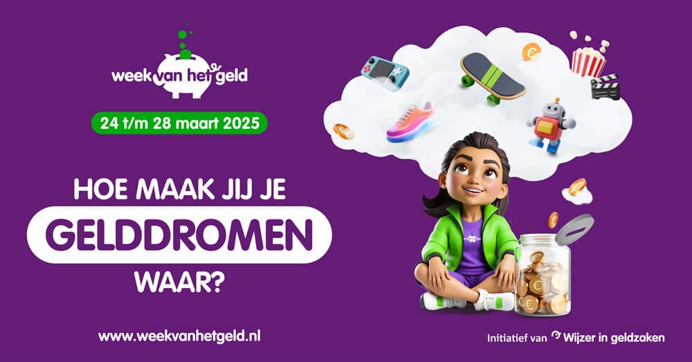 Van 24 t/m 28 maart 2025 vindt de 14e editie van de Week van het geld plaats, een initiatief van Wijzer in geldzaken. Met het thema ‘Hoe maak jij je gelddromen waar?’ zet de onderwijsprojectweek dit jaar jongeren in hun kracht door ze te leren hoe verstandige keuzes bijdragen aan het realiseren van hun gelddromen.