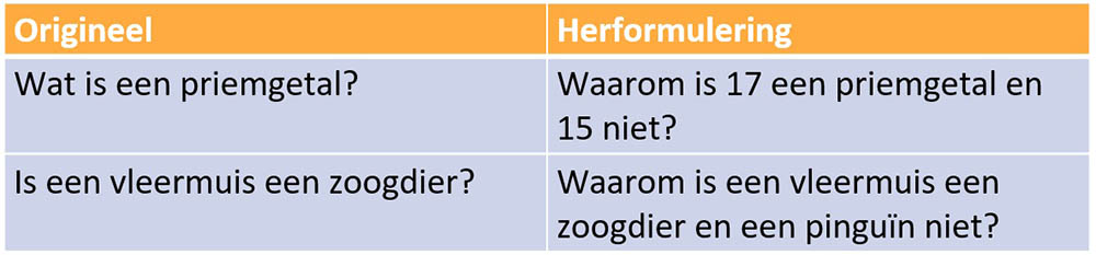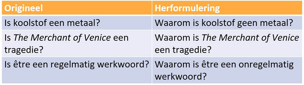 ‘Leraren vinden het prettig om vragen te stellen waarop een duidelijk, ‘goed’ of ‘fout’ antwoord mogelijk is. Eén leerling steekt een vinger op en antwoordt. Dat is hoe intuïtief de meeste vragen worden gesteld in de klas’, zegt Heeren, die zelf ook voor de klas staat. Zij weet maar al te goed dat er voor uitgebreide antwoorden niet altijd tijd is. Toch mogen we van de standaard ja-neevragen afstappen, volgens haar. ‘We moeten veel meer vragen gaan stellen waarmee leerlingen kunnen laten zien wat ze al weten’, zegt Heeren. Zij noemt twee technieken om vragen te herformuleren (zie afbeeldingen). Deze kosten weliswaar wat meer tijd, maar leveren volgens haar kwalitatief meer op. ‘Door vragen anders te formuleren en leerlingen te laten overleggen over de antwoorden, moeten ze veel dieper met de stof bezig zijn. Dat voorkomt dat ze gaan gokken en je ziet de denkwijze achter een antwoord.’ Liever drie inhoudelijke vragen dan tien oppervlakkige, dus.
