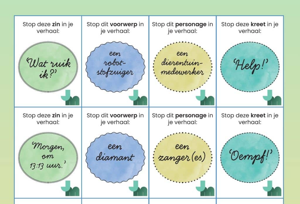 - Geef elk kind na vijf minuten één kaartje. Laat de kinderen de zin / de kreet / het personage / het voorwerp in hun verhaal stoppen. Dit hoeft niet direct, ze mogen er even over nadenken.