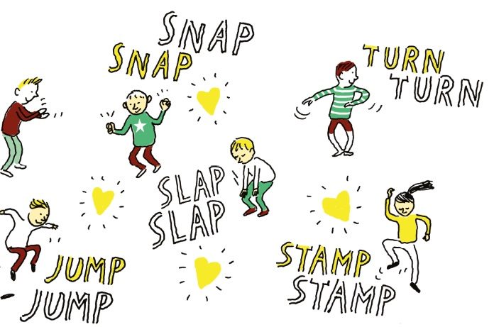 Oefen eerst een aantal keren de volgende instructies: Let’s practise these instructions: clap, snap, slap, jump, turn around, stamp, yell (snap: knip je vingers, slap: klets je dijen). Geef instructies en laat de kinderen deze volgen. Doe eerst nog mee, maar zeg later alleen de woorden. Bijvoorbeeld: Clap, stamp and turn around. / Clap, slap, snap and yell. / Snap, clap, stamp, yell and turn around. Extra instructies: Let’s go faster and faster. We don’t talk, just listen. Kijk hoe snel de kinderen de instructies kunnen volgen en uitvoeren.