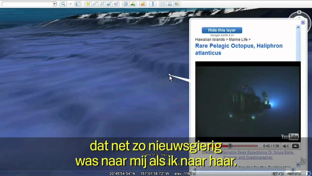 Via Google Earth en ook Google Maps kunnen we op een prachtige manier de aarde bekijken. De laatste tijd komen daar steeds meer prachtige lagen bovenop. De nieuwste toepassing is Google Ocean. Op verschillende plekken in Google Earth kun je de zee in duiken en oceaanbodems verkennen. Op zich zien die er nog niet heel spannend uit. Echt leuk wordt het doordat er filmpjes en informatie van de BBC zijn toegevoegd, bijvoorbeeld van bijzondere zeebeesten. Ook kun je op sommige plekken een quiz spelen van National Geographic.