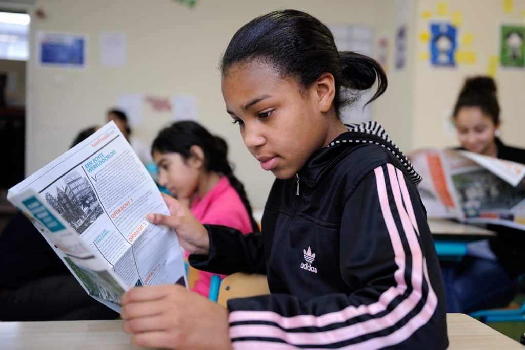 Lesgeven over de Tweede Wereldoorlog zorgt voor inspirerende gesprekken in de klas. Wel kan het een zwaar thema zijn voor kinderen. ‘Het raakt leerlingen. We horen dat kinderen soms echt even de tijd nodig hebben om te reflecteren op wat zij gehoord en gelezen hebben’, vertelt Danielle. ‘Als leerlingen creatief aan het werk zijn kunnen ze de boodschap verwerken.’ Dit principe is ook meegenomen in het samenstellen van de Anne Frank Krant 2023. De Krant komt met een extra ‘Vijf tegen onrecht’, vijf mappen vol informatie en bronnen waar leerlingen samen een poster van maken. Het is voor kinderen bovendien belangrijk dat er met een hoopvolle boodschap wordt afgesloten. Danielle: ‘Dat is eigenlijk de gouden tip’. De Anne Frank Krant licht om deze reden het verhaal van Otto Frank uit. Hij overleeft en brengt Annes dagboek uit. ‘Dat dagboek kunnen mensen nu nog steeds bekijken. Mensen kunnen de verhalen lezen die Anne wilde uitbrengen. Door hoopvol af te sluiten kunnen leerlingen het onderwerp beter een plekje geven.’