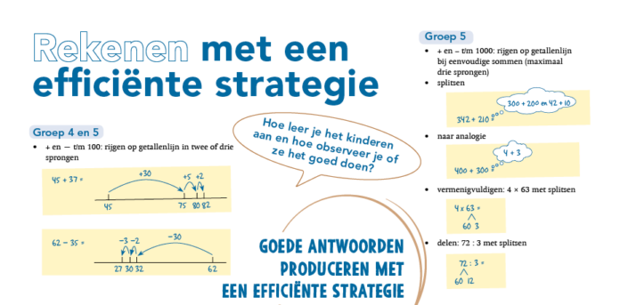 Het is niet (meer) zo dat we alles maar uit de kinderen laten komen en dat alles wat de kinderen verzinnen ook goed is. De regie ligt bij de leerkracht. Die weet (ondersteund door een goede methode) wat wel of niet goed is. Kinderen leren uiteindelijk (onder leiding van de leerkracht) op basis van de getallen een verantwoorde keuze te maken voor een strategie. Lees meer praktische tips voor het observeren en gebruiken van de gewenste strategie in het volledige artikel Rekenen met een efficiënt strategie.