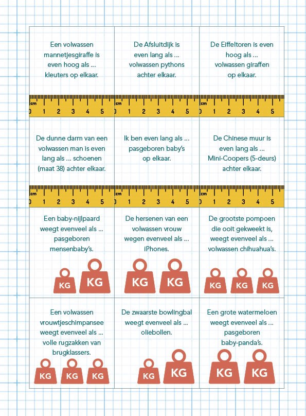 Met deze meetkaartjes gaan de kinderen aan de slag met lengte en gewicht. Zónder weegschalen en meetlinten, maar met nijlpaarden, bowlingballen, schoenen, chihuahua’s en nog veel meer.