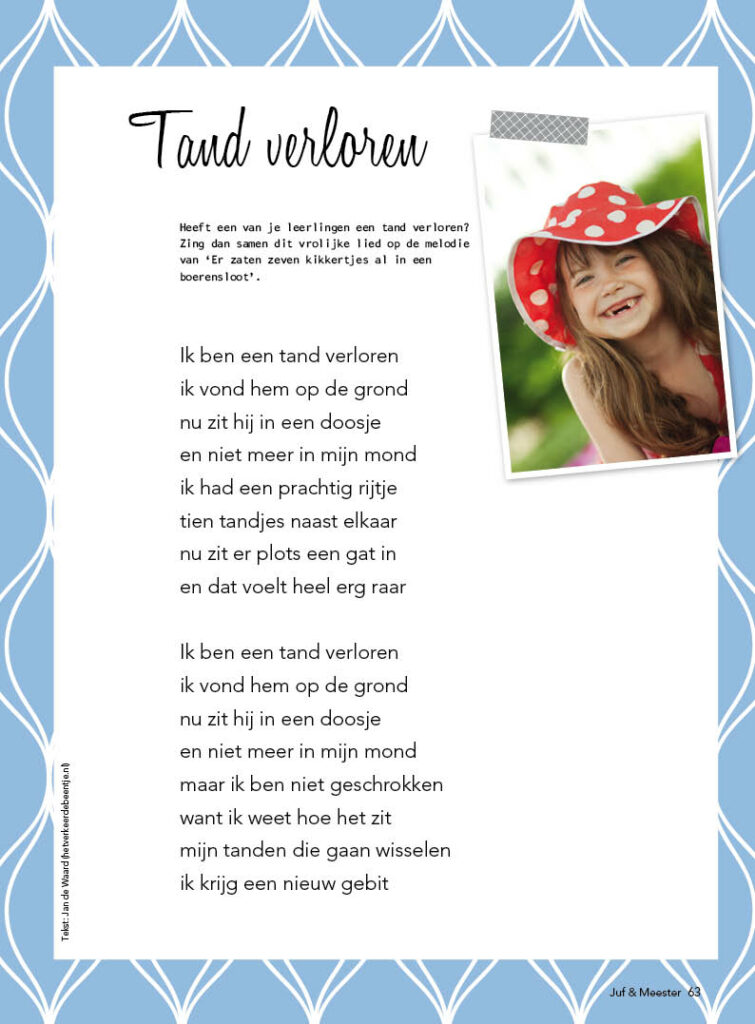 Heeft een van je leerlingen een tand verloren? Zing dan samen dit vrolijke lied op de melodie van ‘Er zaten zeven kikkertjes al in een boerensloot’.