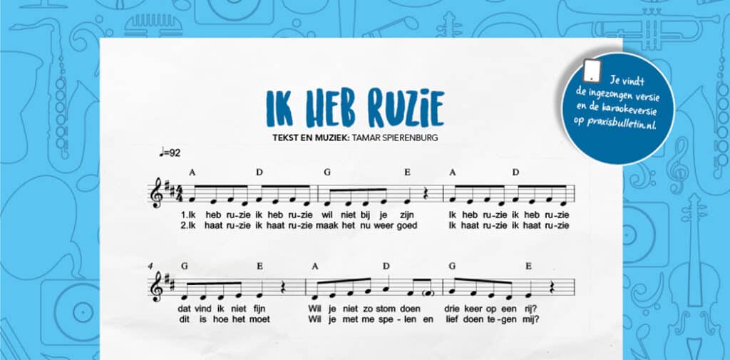Gebruik de vraag-antwoord methode bij dit liedje. De ene groep zingt: ‘ik heb ruzie, ik heb ruzie’ en de andere groep zingt: ‘wil niet bij je zijn’. Zo kun je het hele lied zingen.