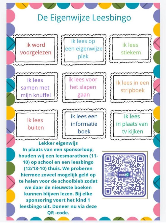 Het weekend aansluitend op de Leesmarathon voerden kinderen thuis een Leesbingo uit. Ouders, grootouders en kennissen konden het kind sponsoren om een leesactiviteit van de bingokaart uit te voeren. Daarop stonden leuke challenges zoals ‘lezen op een eigenwijze plek’, ‘buiten lezen’ en ‘stiekem lezen’. ‘De leerkracht van groep 5 had de kinderen uitgedaagd om een zo gek mogelijke plek uit te zoeken om te lezen. Dit is gelukt! Eén kind heeft achterstevoren op een paard gelezen. De ander hing aan het duikelrek. Eén kind las op een dakkapel. Ze vonden de gekste plekken! De actie leverde ons € 1.200 op, waarmee we ervoor zorgen dat de schoolbieb kan blijven draaien met steeds nieuwe boeken.’