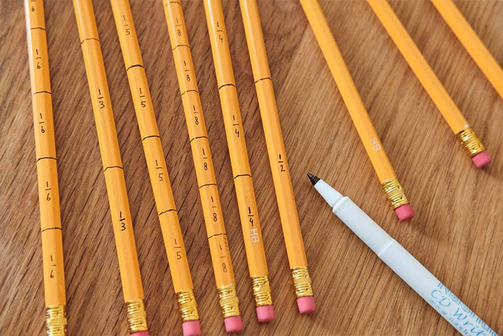 Met deze potloden worden breuken niet alleen tastbaar, ze zijn ook nog eens altijd aanwezig. Versier nieuwe potloden met een watervaste zwart pen voordat je ze uitdeelt. Ieder potlood krijgt een andere breuk. Betrek de potloden in de rekenles en gebruik ze voor korte rekenspelletjes tussendoor.
