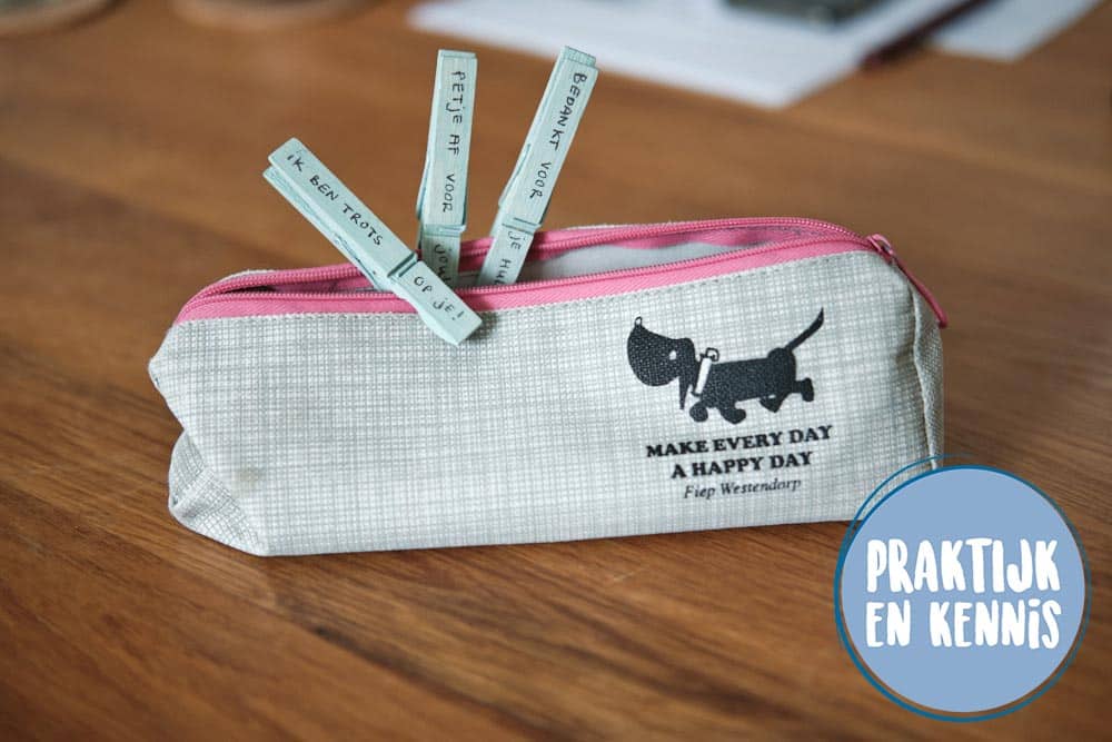 Met wasknijpers, verf en een zwarte stift maak je van complimenten geven een feest. Vanaf nu deel je ze namelijk letterlijk uit. Beschrijf de gekleurde wasknijpers met mooie complimenten, laat de verf en later de stift goed drogen en hang ze op een zichtbare plek in de klas. Klem regelmatig een toepasselijke wasknijper op een etui, rekenboek of trui en geniet van de glimlach die daarop volgt. Of laat de kinderen complimenten uitdelen aan elkaar.