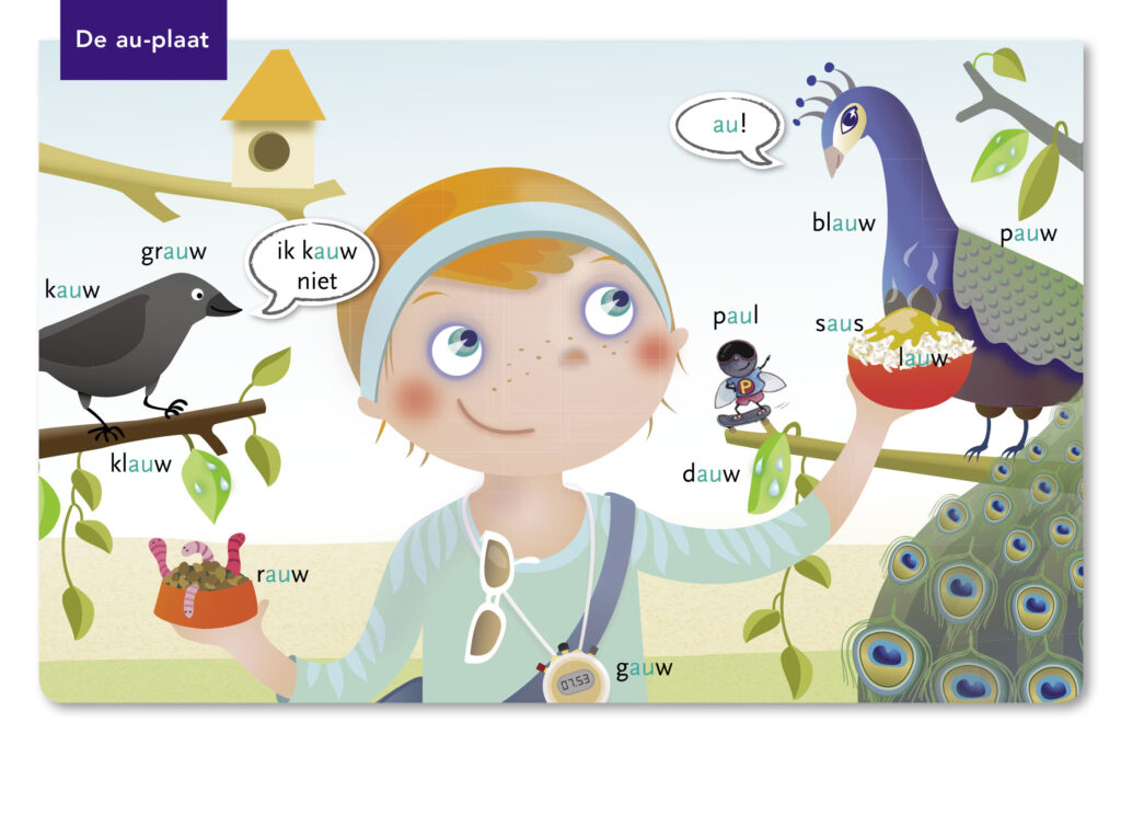 In de eerste helft van het schooljaar leren de kinderen de verschillen tussen ei en ij en au en ou. Kinderen leren deze klanken door herhaling en inslijpen. De ei-plaat en de au-plaat, gebaseerd op het ei-verhaal en het au-verhaal, ondersteunen hen daarbij. De afspraak is steeds: staat een woord op de plaat en komt het voor in het verhaal, dan schrijf je de ei (of au). Zo niet, dan schrijf je ij (of ou).