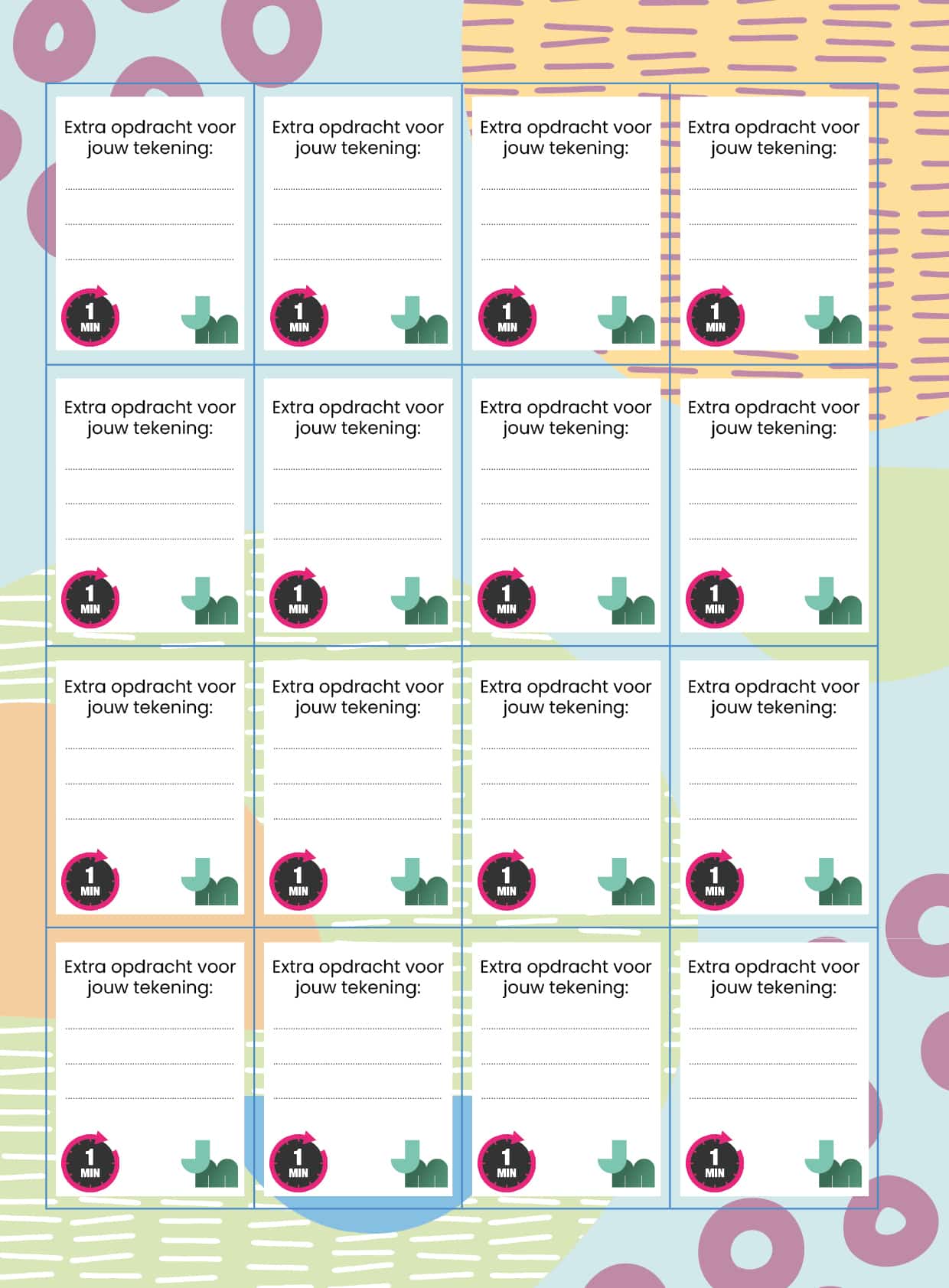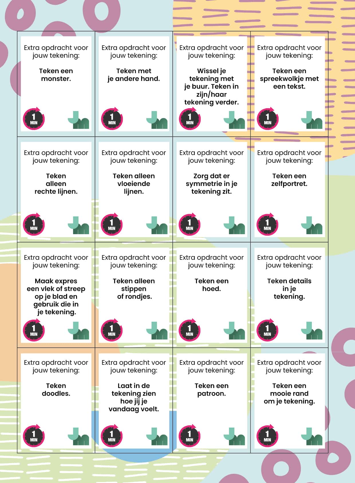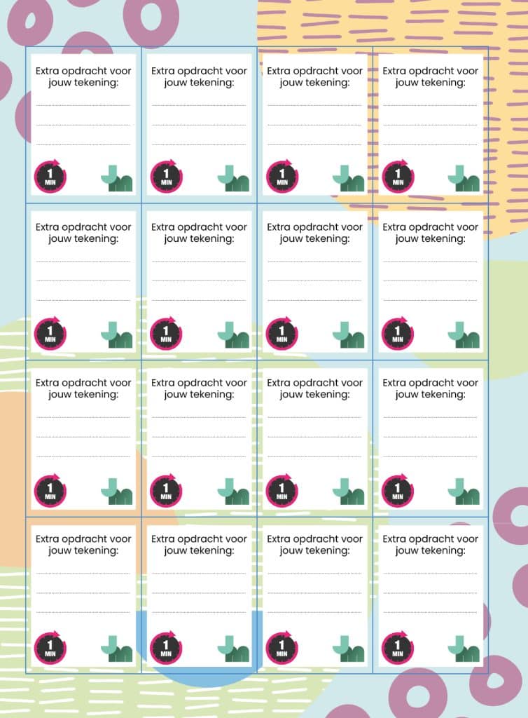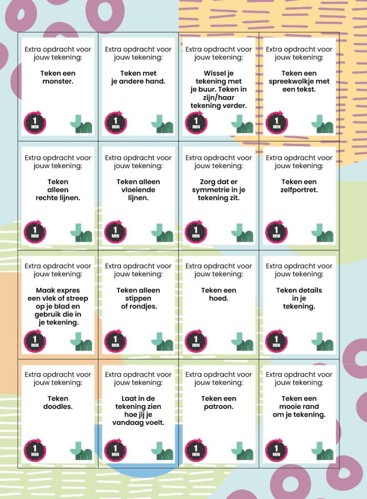 - Deel na enkele minuten de kaartjes uit: elk tweetal krijgt één kaartje. Op het kaartje staat een tekenopdracht die ze allebei in hun eigen tekening moeten verwerken. Ze krijgen hiervoor één minuut de tijd. Benadruk dat de kinderen niet te veel over de opdracht na moeten denken, maar juist moeten tekenen wat in hen opkomt.
