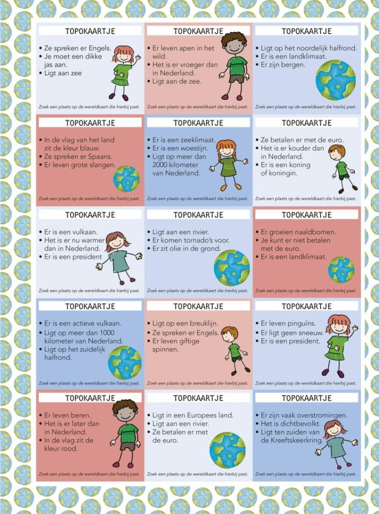 Met deze topokaartjes reizen de kinderen de wereld rond. Aan de hand van drie criteria zoeken ze een plek. Of het nu een dorpje, stad, streek of land is: het is allemaal goed, zolang het maar voldoet aan de drie criteria op het kaartje.