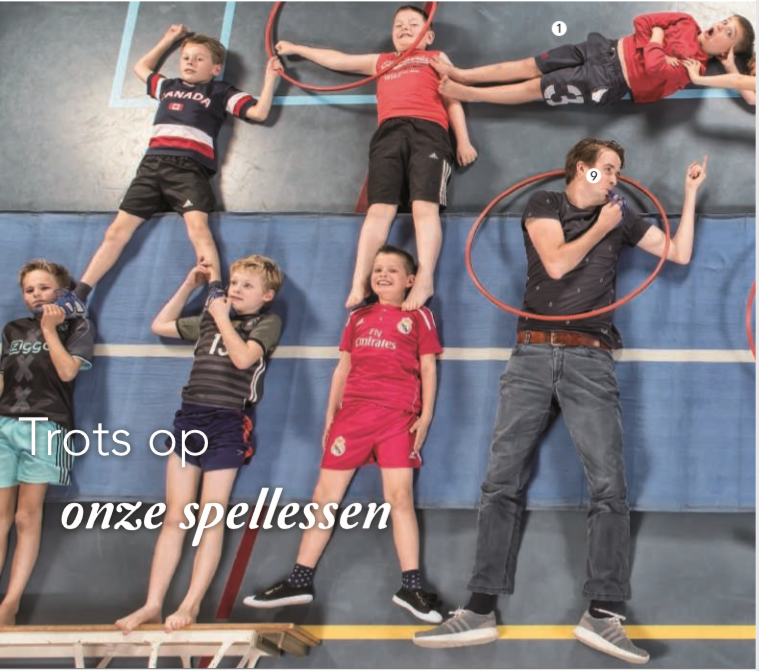 Meester en gymleerkracht Matthijs Jansen van basisschool De Brug in Nieuwerbrug bedacht spellen om tijdens de gymles álle kinderen in beweging te krijgen. Inmiddels zijn de spellessen een enorm succes. Juf & Meester zette Matthijs en 16 enthousiaste leerlingen op de foto. Filmpjes en inspiratie vind je op www.despelles.nl.