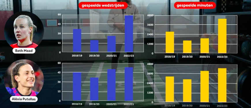 5. Bekijk de staafdiagrammen van Beth Mead en Alexia Putellas. Leg uit dat hier terecht voor staafdiagrammen is gekozen en niet voor lijndiagrammen.