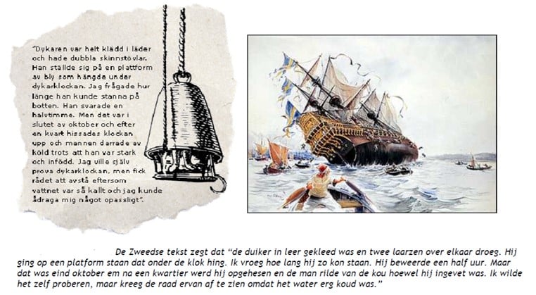 4. Als een mens dieper wil duiken dan 1 meter, moet er dus lucht mee. In de 17e eeuw had men daarvoor al een constructie bedacht. In augustus 1628 zonk het Zweedse vlaggenschip de Vasa bij haar eerste tocht. Aan boord waren allerlei kostbaarheden, onder andere 64 kanonnen. De Zweed Albreckt von Treileben en de Duitser Andreas Peckell bouwden een ijzeren duikklok om de kanonnen van 30 meter diepte naar boven te halen. In de bovenlaag van de klok bevond zich een luchtzak, waar de duiker zijn lucht uit moest halen (zie afbeelding). In 1664 en 1665 werden zo 50 kanonnen naar boven gehaald. De duiker had het na een kwartier erg koud gekregen. Leg uit dat hij niet alleen door de kou maar kort in de duikklok kon verblijven.
