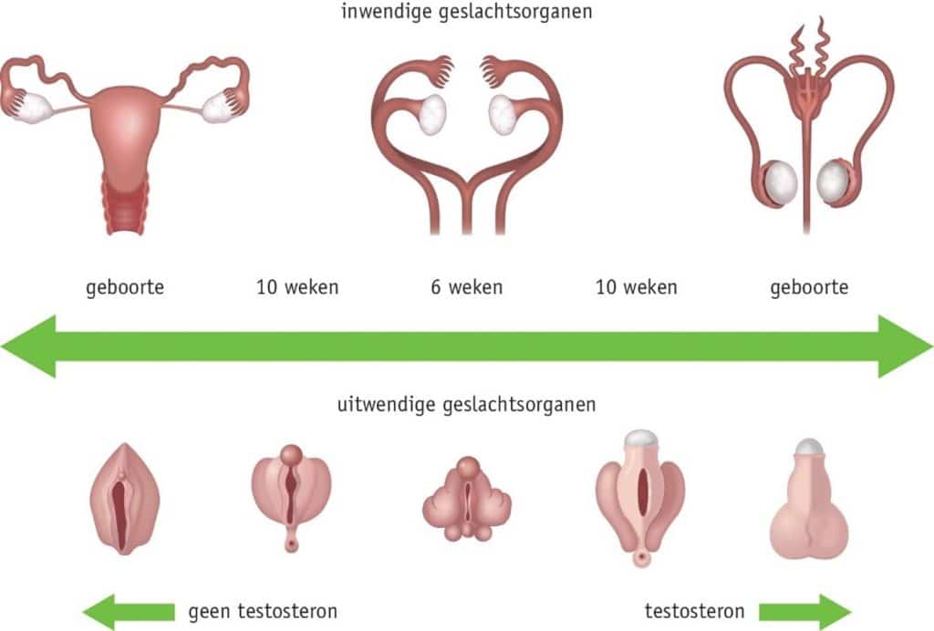 Als de ongeboren baby testosteron vormt, ontstaan dus mannelijke geslachtsorganen. Als de ongeboren baby geen testosteron vormt, ontstaan vrouwelijke geslachtsorganen.