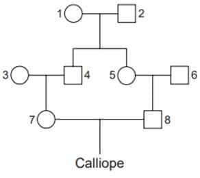 5. In een roman van de Amerikaanse schrijver Jeffrey Eugenides komt een XY-meisje Calliope voor. In de afbeelding hierboven is de stamboom van haar familie weergegeven. Twee van haar grootouders (nummer 4 en nummer 5) zijn broer en zus. Leg uit dat Calliope géén AOS geërfd kan hebben van haar overgrootvader (nummer 2 in de stamboom).
